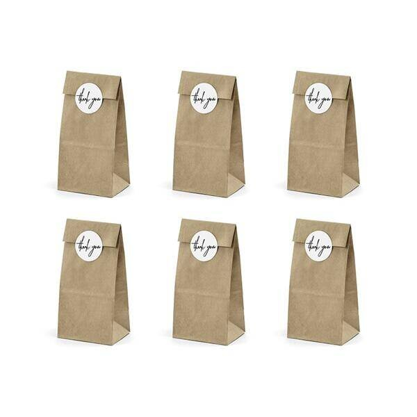 Torebki na słodycze Thank You 8x18x6cm 6 szt. kraft z 6 białymi naklejkami z napisem Thank You.