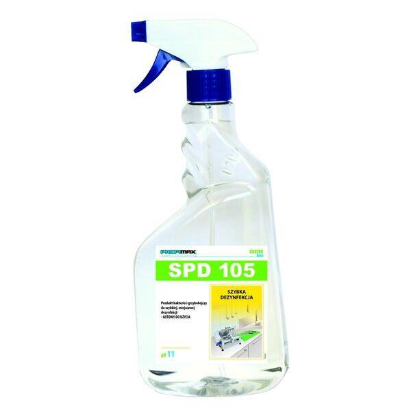 SPD 105 jest ciekłym, alkoholowym środkiem biobójczym. Może być stosowany na wszystkich powierzchniach podłogowych i ponad podłogowych (lady, stoły itp.) oraz urządzenia (krajalnice, bemary, komory chłodnicze itp.). Środka nie należy stosować na powierzchniach wrażliwych na alkohol takich jak: pleksi, szkło akrylowe itp. Produkt posiada pozwolenie na obrót produktem biobójczym zgodnie z decyzją nr 4196/10 wydaną przez Ministra Zdrowia.