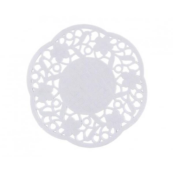 Serwetka papierowa 11cm 50 szt. biała z pięknymi laserowo wyciętymi wzorami. Nadaje się jako osobna ozdoba stołu bądź jako podkładka pod ciasto.