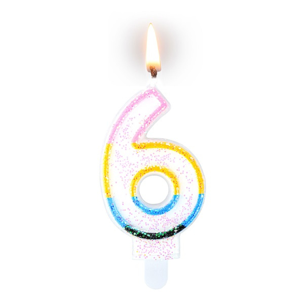 Świeczka cyferka "6" kolorowa tęcza z brokatem to świetna ozdoba przyjęcia urodzinowego. Idealnie prezentuje sie na torcie z okazji urodzin czy rocznicy.