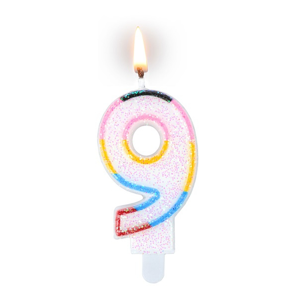 Świeczka cyferka "9" kolorowa tęcza z brokatem to świetna ozdoba przyjęcia urodzinowego. Idealnie prezentuje sie na torcie z okazji urodzin czy rocznicy.