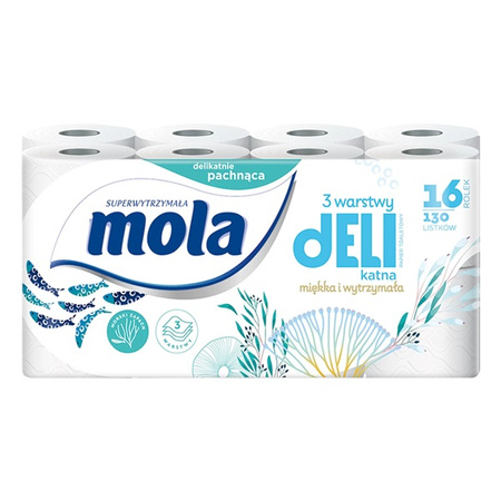 MOLA Papier toaletowy Morski 3W 16 szt. biały to wysokiej jakości, śnieżnobiały, 3-warstwowy papier toaletowy. Jego eleganckie, subtelne tłoczenie w kształcie małych poduszeczek sprawia, że jest delikatny dla Ciebie i twojej skóry, ale zarazem mocny i wytrzymały. Każda rolka to aż 130 wydajnych listków dla codziennego komfortu twojej rodziny. Produkt o delikatnym morskim zapachu.